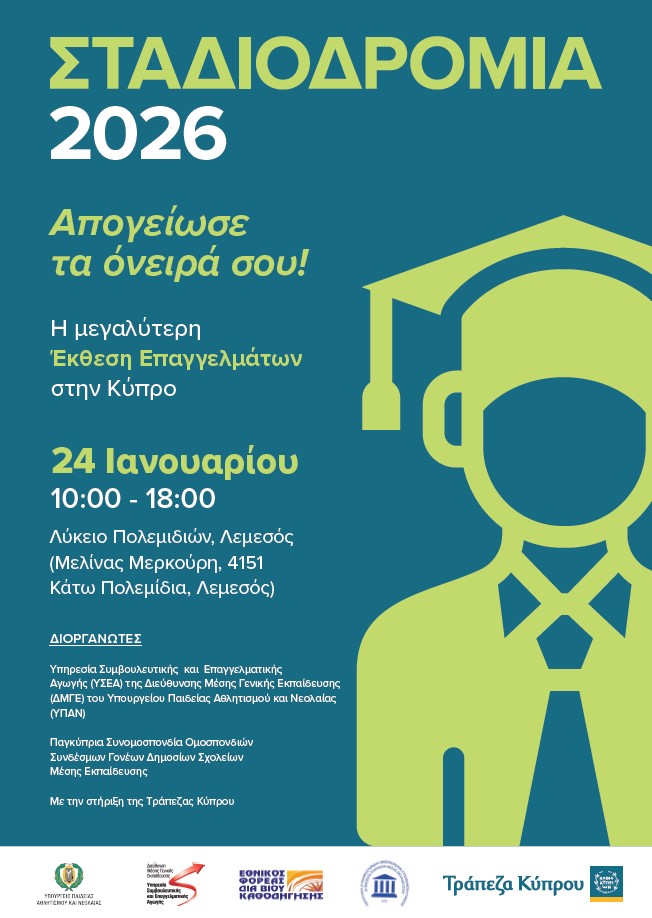 «Σταδιοδρομία 2026», το Σάββατο, 24 Ιανουαρίου 2026, στο Λύκειο Πολεμιδιών στη Λεμεσό (Μελίνας Μερκούρη, 4151, Κάτω Πολεμίδια, Λεμεσός), από τις 10:00 π.μ. – 18:00 μ.μ. με τη συμμετοχή μεγάλου αριθμού έγκριτων Επαγγελματικών Συνδέσμων / Συλλόγων και άλλων Φορέων.
