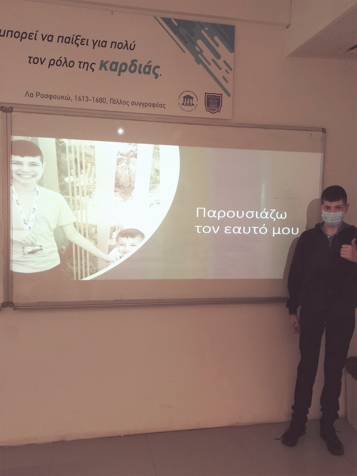Η πρώτη ενότητα του μαθήματος «Αυτογνωσία» ολοκληρώνεται με τις παρουσιάσεις των μαθητών μας. Όλοι οι μαθητές κλήθηκαν να παρουσιάσουν τον εαυτό τους στους συμμαθητές τους. Μέσα από τις παρουσιάσεις πρόβαλαν πτυχές της προσωπικότητάς τους, τα ενδιαφέροντά τους, τα δυνατά στοιχεία του χαρακτήρα τους αλλά και τις αδυναμίες τους. Οι παρουσιάσεις, οι οποίες έχουν ιδιαίτερο ενδιαφέρον, θα ολοκληρωθούν με το τέλος του Α’ τετραμήνου.