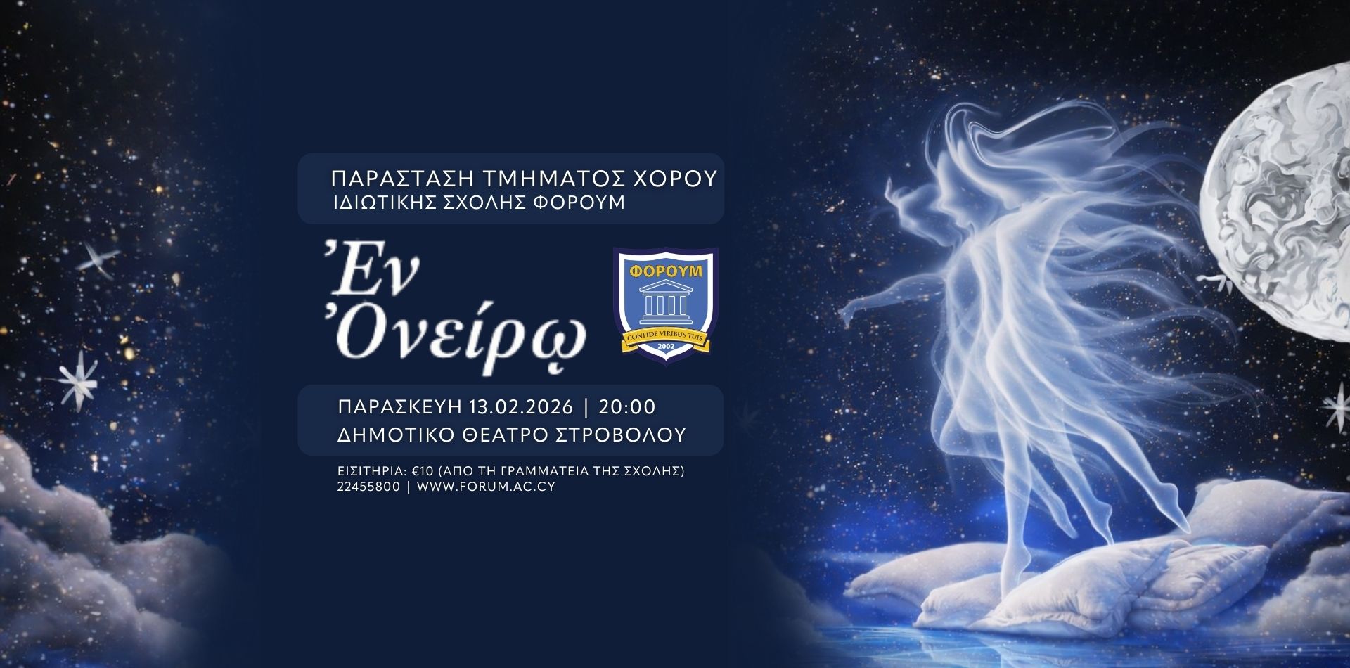 Η Διεύθυνση, οι διδάσκοντες/ουσες και οι μαθήτριες του Τμήματος Χορού της Ιδιωτικής Σχολής Φόρουμ σας προσκαλούν με ιδιαίτερη χαρά στην παράσταση του τμήματος «Ἐν ὀνείρῳ», που θα πραγματοποιηθεί την Παρασκευή 13.2.2026 και ώρα 20:00, στο Δημοτικό Θέατρο Στροβόλου.