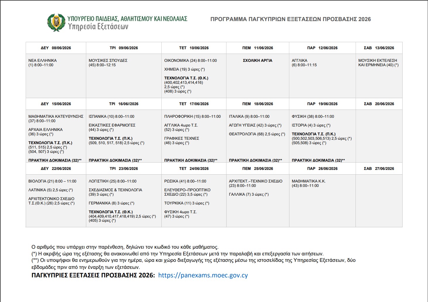 Oι Παγκύπριες Εξετάσεις Πρόσβασης 2026 αρχίζουν στις 8 Ιουνίου και ολοκληρώνονται στις 26 Ιουνίου 2026.